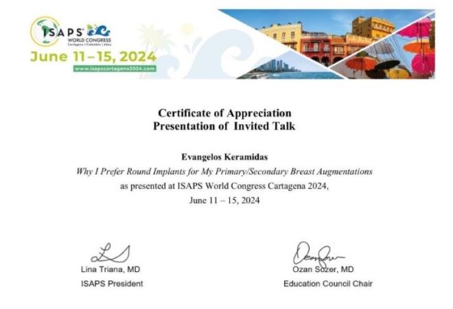 - Την Τετάρτη 12 Ιουνίου, ο Δρ. Ευάγγελος Κεραμίδας μίλησε στους συνέδρους, στο session, με τίτλο: “Novel techniques in Breast Augmentation”, που αφορά τις νεότερες χειρουργικές τεχνικές της Πλαστικής και Αισθητική Χειρουργικής στη χειρουργική του μαστού, ένα θέμα το οποίο έχει επανειλημμένα παρουσιάσει, σε παγκόσμια συνέδρια Αισθητικής Πλαστικής Χειρουργικής. Ο τίτλος της ομιλίας του ήταν: “Why I Prefer Round Implants for My Primary/Secondary Breast Augmentations”.