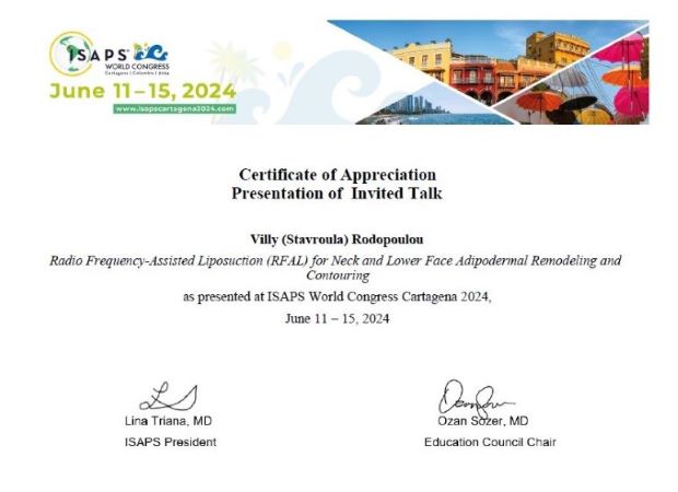 - Την Πέμπτη 13 Ιουνίου, η Δρ. Βίλλυ Ροδοπούλου, στο session, με τίτλο: “Treatment of High Volume and Obtuse Necks” σχετικά με τις εξελιγμένες μη επεμβατικές τεχνικές της Αισθητικής Επιστήμης μίλησε για την εφαρμογή των ραδιοσυχνοτήτων και της λιποαναρρόφησης στην περιοχή του λαιμού και του οβάλ του προσώπου. Ο τίτλος της ομιλίας της ήταν: “Radio Frequency - Assisted Liposuction for Neck and Lower Face Adipodermal Remodeling and Contouring”.